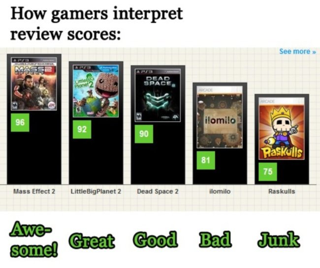 Si uno se pone a ver las hojas y los comentarios, te dicen que el juego es una cosa u otra, pero luego en la nota de 70 no baja. Da igual que el juego sea una copia de otro, que duré 4-5 horas, o que sea de todo, las notas son siempre altas. Sin contar que muchas cosas que pueden molestar como errores tontos de la IA, pequeñas texturas o repetición de movimientos no se cuentan. Cuando una persona ve notas de películas y esta es menor de 5… uno se echa a temblar, pero si es mejor de 3 es horrible. Estas notas NUNCA se ven en juegos.
