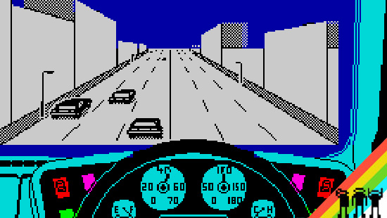 Por supuesto, no hablamos de verdaderas 3D sino de una simulación, pero el efecto está tan logrado que no podemos hacer menos que quedar maravillados del ingenio del programador. Los giros de los coches, al cambiar de calle, se producen de una manera un tanto extraña, con un cambio de pantalla que puede hacernos perder brevemente el sentido de la posición, pero nos acostumbraremos en seguida. En todo caso, si nos fijamos, se resuelve de manera perfecta los dos tipos de movimiento que podemos hacer al mover el volante: cambiar de carril o bien pulsar el botón de disparo a la vez con lo cual haremos un giro completo para cambiar de calle. Sencillo y adaptado a las limitaciones del hardware.